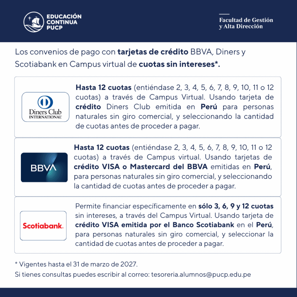 Además, la PUCP ofrece convenios especiales en pagos con tarjeta de crédito a los que puedas acceder para aprovechar la oportunidad de seguir aprendiendo y creciendo.
