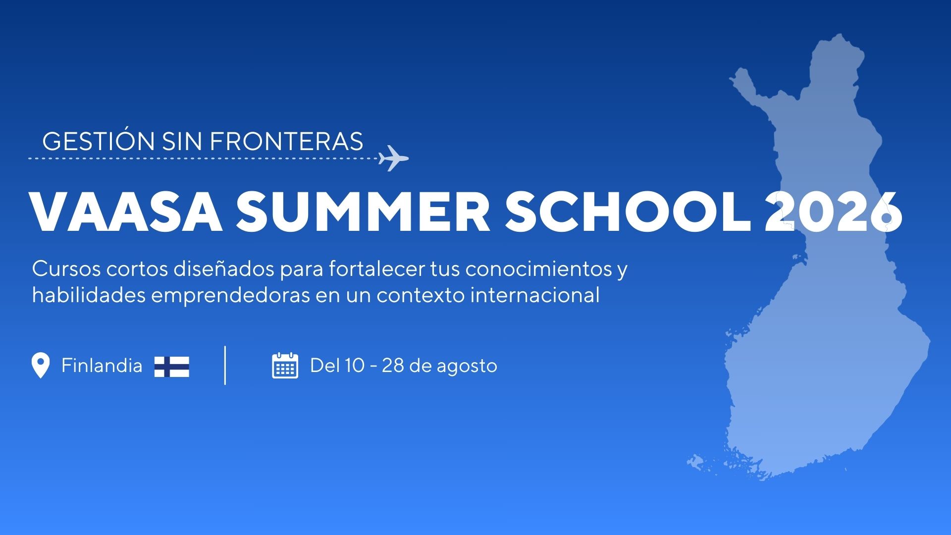 La Facultad de Gestión y Alta Dirección abre la convocatoria para que estudiantes participen en el Vaasa Summer School on Entrepreneurship and Venturing, programa organizado por la University of Vaasa (Finlandia). Esta experiencia académica internacional ofrece cursos gratuitos que se desarrollarán de manera presencial en agosto de 2026.