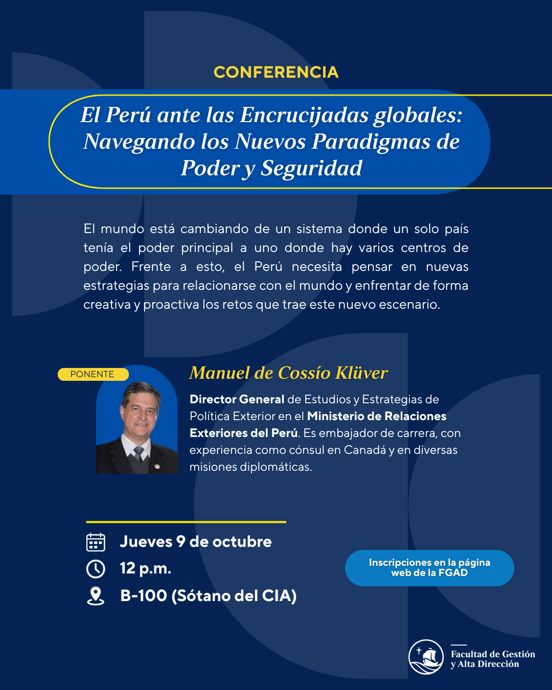 En esta exposición, el Embajador De Cossío ofrecerá una mirada al nuevo escenario mundial, que está pasando de un liderazgo único a uno con varias potencias influyentes. Este cambio trae un contexto incierto, con reglas menos claras y relaciones internacionales más impredecibles. Ante este panorama, se propondrán ideas y estrategias que el Perú podría adoptar para enfrentar estos desafíos y aprovechar las oportunidades que surjan.