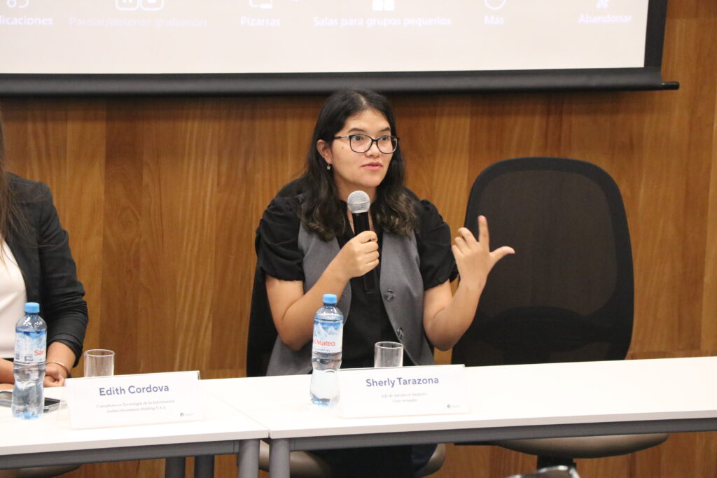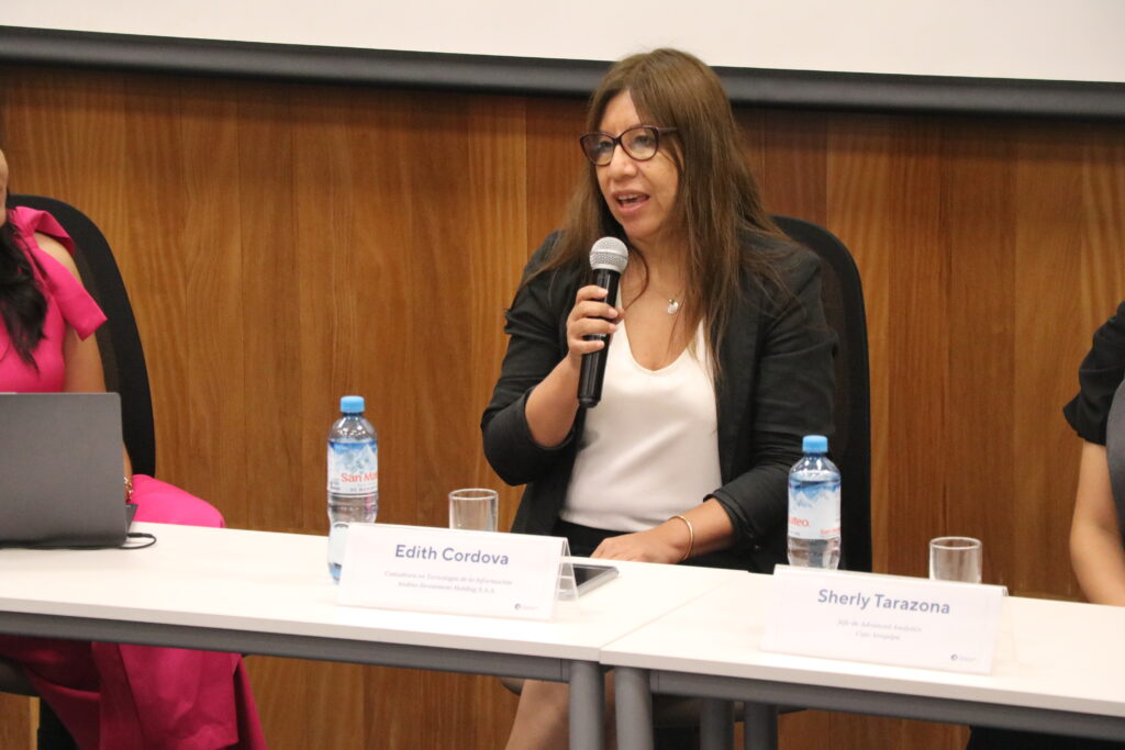El segundo panel se centró en las aplicaciones estratégicas y la analítica avanzada, y contó con la participación de Stephany Serrato, consultora senior en Gobierno y Gestión de Datos, junto a Sherly Tarazona (Caja Arequipa) y Edith Córdova (Andino Investment Holding S.A.A.). En este espacio, se compartieron experiencias sobre el uso de datos en distintos sectores y se discutieron los retos de implementar soluciones de inteligencia artificial en entornos reales. Las expositoras destacaron la importancia de definir correctamente los problemas de negocio, contar con información adecuada y alinear las iniciativas tecnológicas con objetivos estratégicos claros, así como el rol clave de los equipos interdisciplinarios para traducir datos en valor.