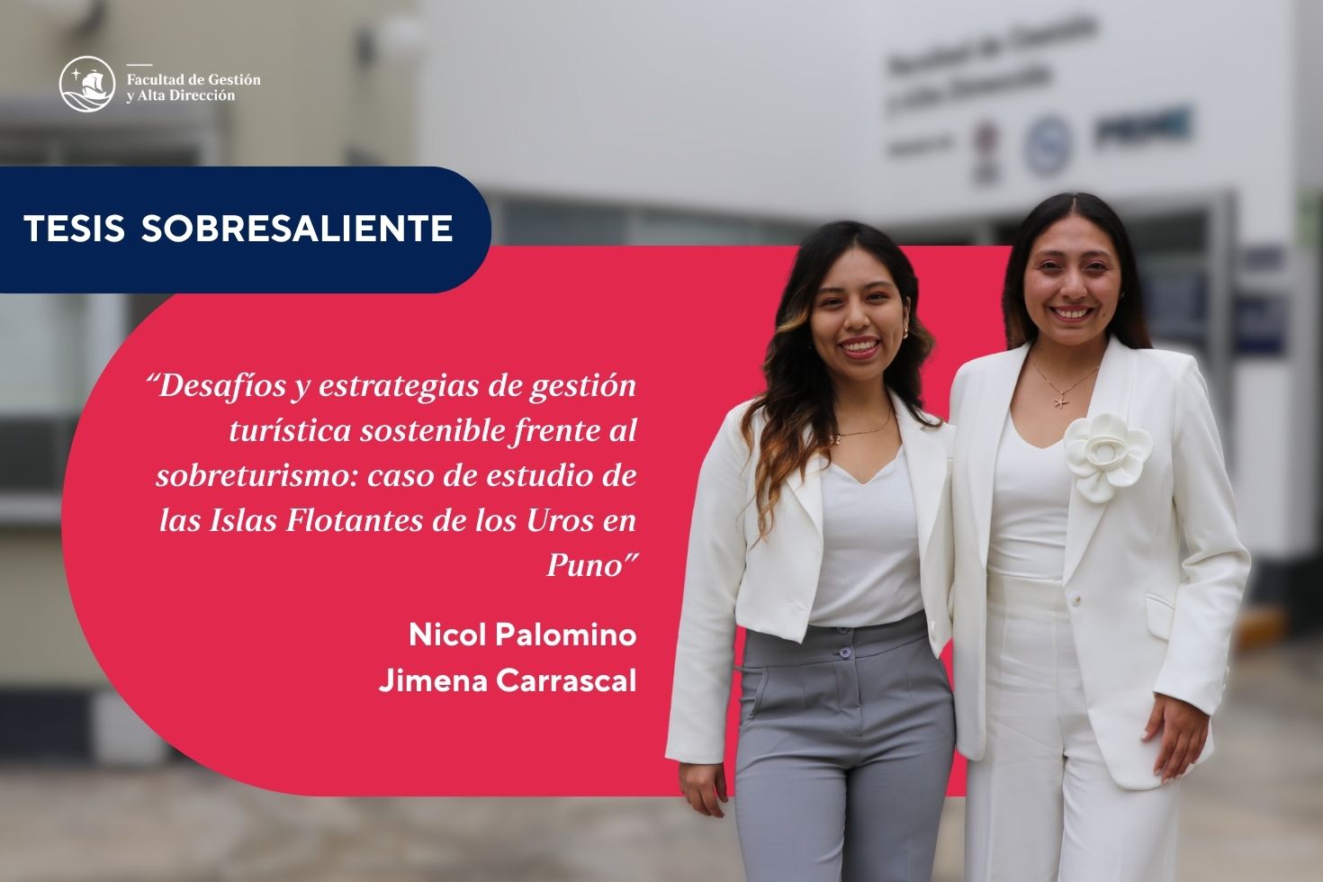 El jueves 2 de octubre, Nicol Palomino Salvatierra y Jimena Carrascal Zevallos sustentaron su tesis «Desafíos y estrategias de gestión turística sostenible frente al sobreturismo: caso de estudio de las Islas Flotantes de los Uros en Puno», una investigación que busca aportar al conocimiento local y a la preservación de uno de los destinos turísticos del país.