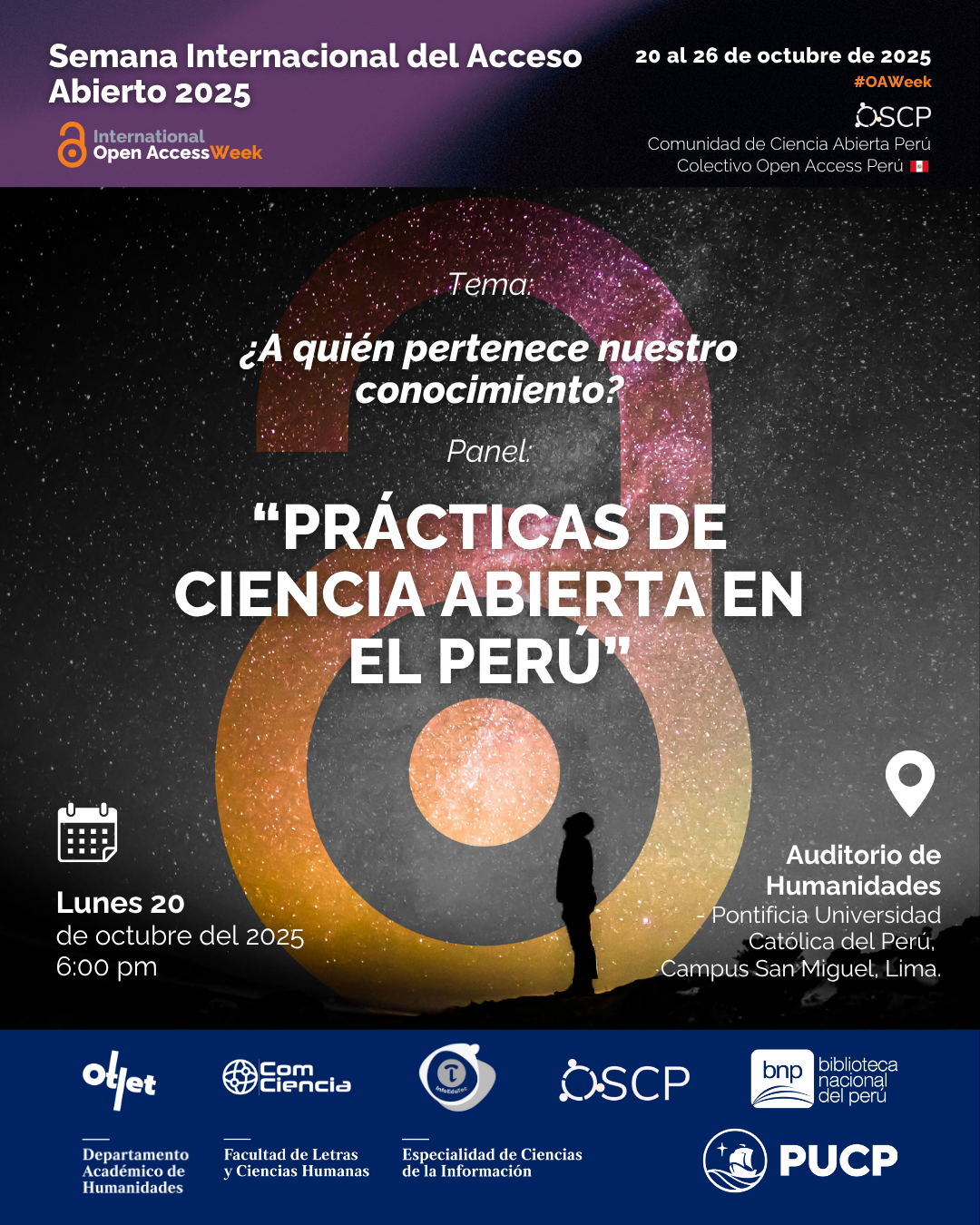 En el marco de la Semana Internacional del Acceso Abierto 2025, la carrera de Ciencias de la Información de la Pontificia Universidad Católica del Perú y el Colectivo Open Access Perú anuncian la realización del panel “Prácticas de Ciencia Abierta en el Perú”, un espacio de reflexión y debate en el que se discutirán los principales avances, retos y oportunidades de la Ciencia Abierta en nuestro país.
